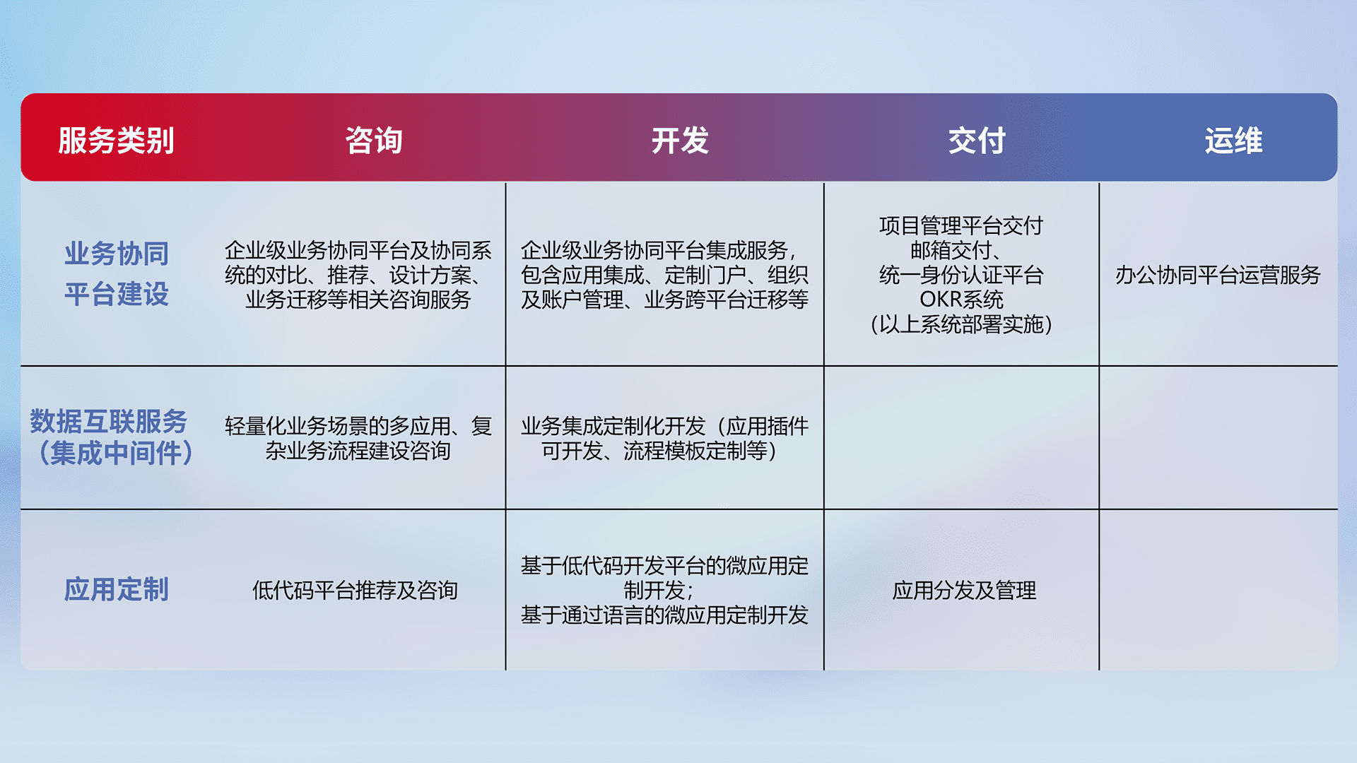 针对钉钉、、企微、、IDaas等平台级产品提供产品的规划、、、、方案、、、交付、、定制化开发等服务,,,,实现如统一协同办公、、、、智能客户服务、、、混合会议管理、、智能数据查询、、、、等业务场景,,,实现数字化转型。。